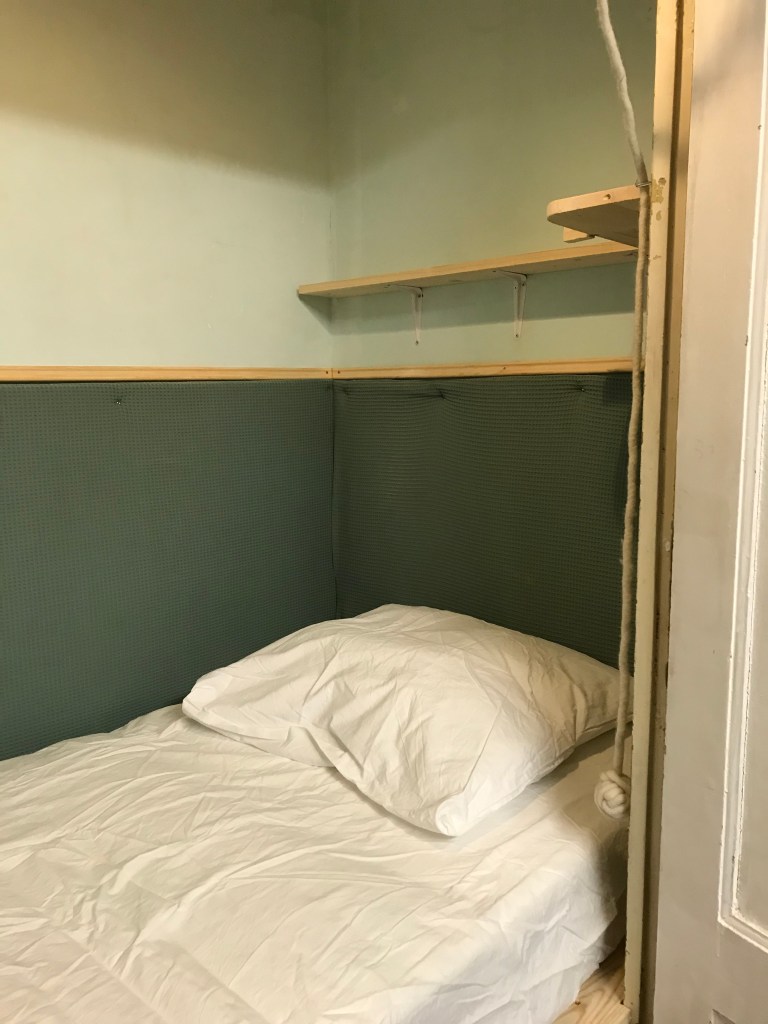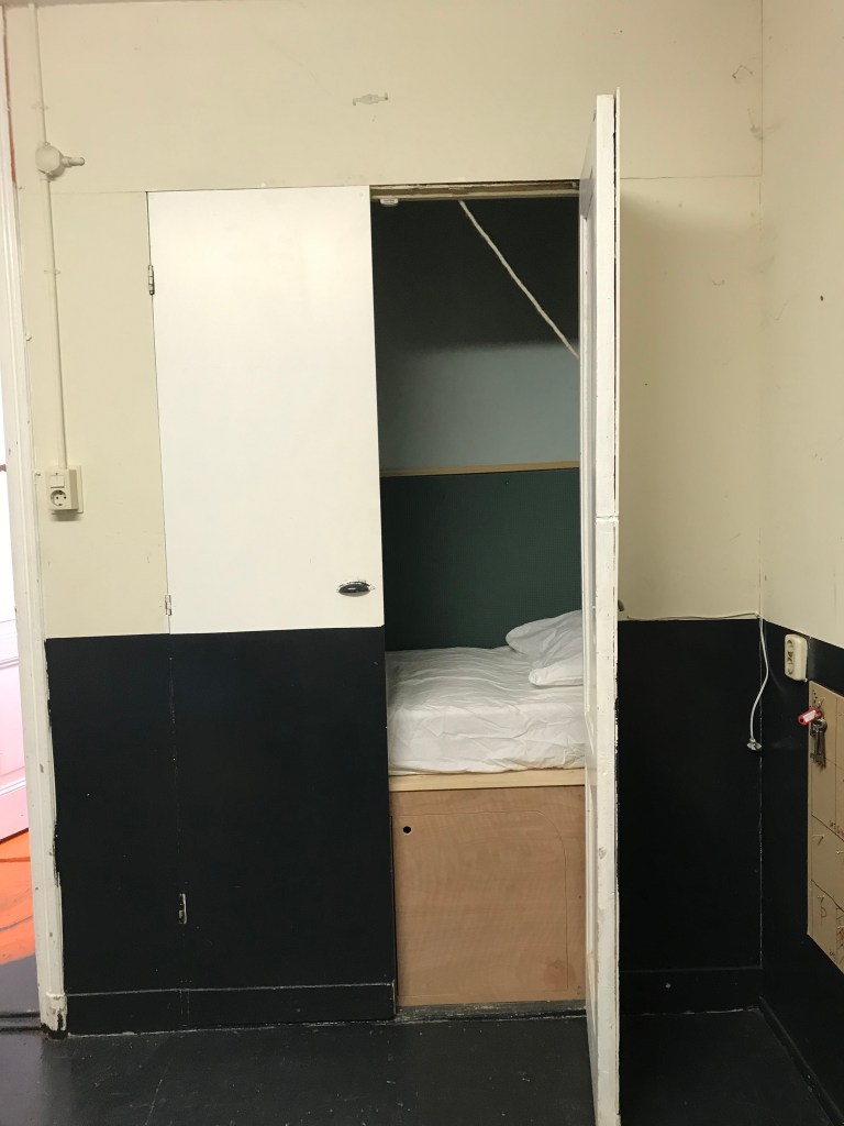 first keeping the empty houses safe from a possible squatting scenario, second create a system of the temporary house for the duration of six months, which from this temporariness housing corporation could gain a benefit, third test the system of alternative living/working possibility for ‘artists’ and ‘creatives’ which they are not related to the history and character of the neighbourhood and street. Napotism is a Bedstee (traditional western bed/bedroom) made in the existing cupboard at the ‘office room’ of PensionAlmonde.