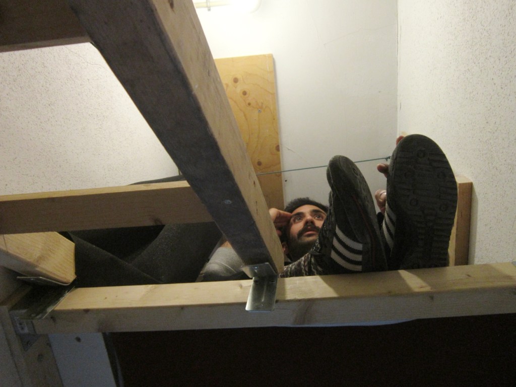 “The room of an architect” is a project to criticise and represent the conditions of living and working with which the young precarious nomadic architect deals with. It offers strategies in re-using the unused spaces of existing buildings, namely the staircase, instead of making new buildings, to respond to a very current living/working condition.