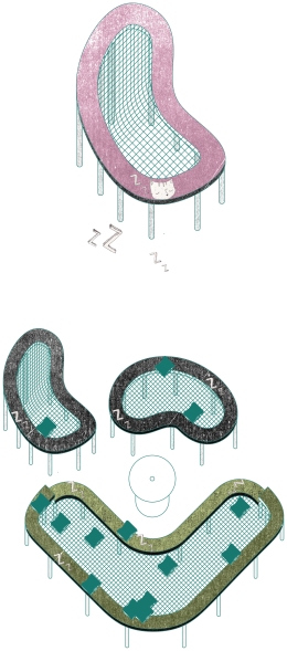 Through the display of comfortable bodies, we propose to tackle the current trends of security which resulting in limitation, conditioned by fear. To tackle the situation we take on 4 main components: Comfort, Community, Visibility, and Spatial Hacking.